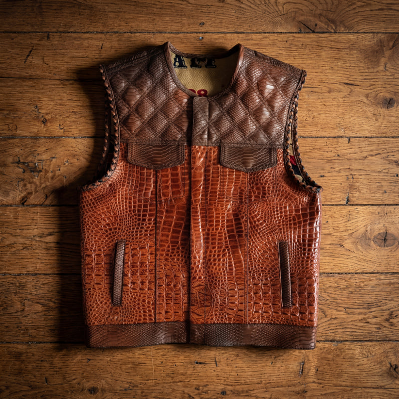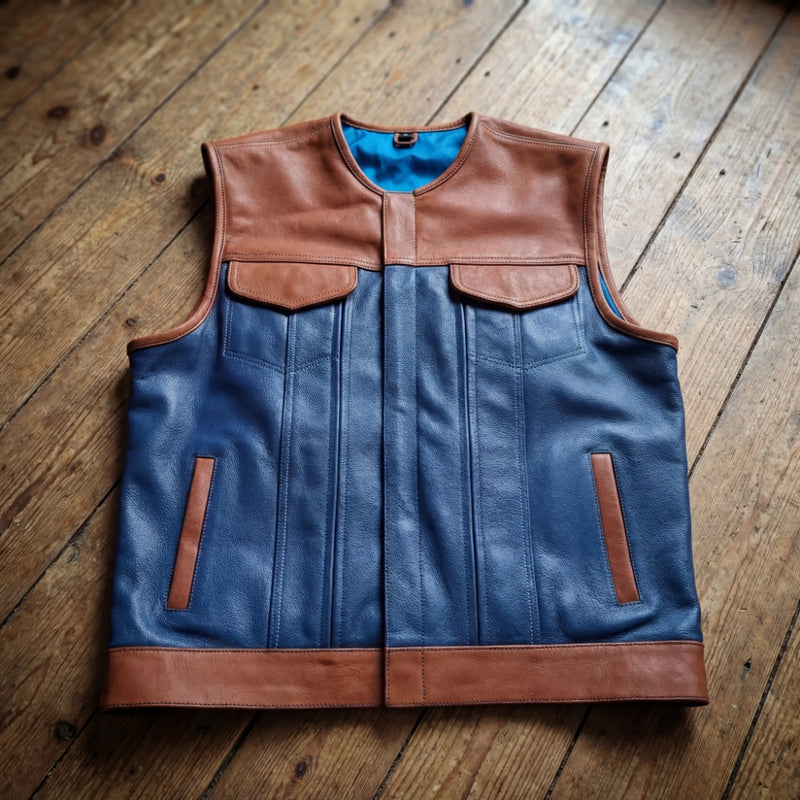 Full-Grain Cowhide: It is the industry standard. sturdy, resistant to abrasion, and designed to age well. The best option for performance-oriented custom leather vests and jackets.