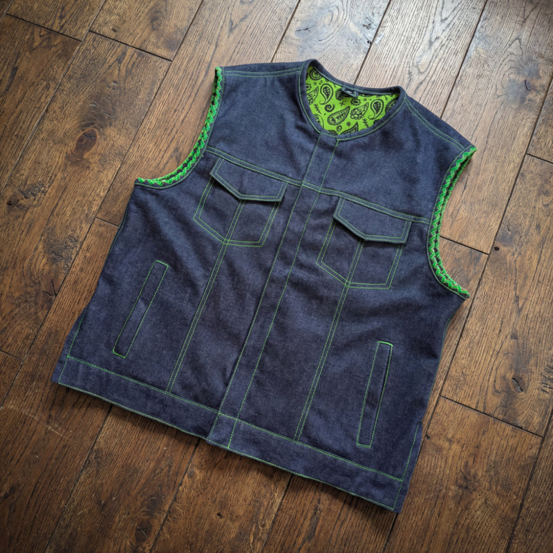 In addition to leather, our builder can create custom denim vests and canvas motorcycle vests that have a tough, worn-in appearance.