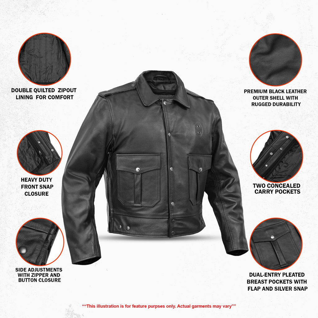 The Alpha Badge Men’s Leather Motorcycle Jacket from our Police Line Collection isn’t just outerwear—it's rider's armor, built from premium black leather to deliver unmatched toughness, refined design, and authentic biker spirit. From the city streets to long open highways, this jacket is made to perform. Designed with precision detailing, the Alpha Badge features double quilted lining, heavy-duty YKK zippers, and reinforced stitching to withstand the toughest rides. Functional extras like underarm vents for airflow, side adjustments with zippers and snaps, and an action back design make it as practical as it is stylish. This isn’t just a jacket—it’s a symbol of biker identity, built for protection, freedom, and the open road.