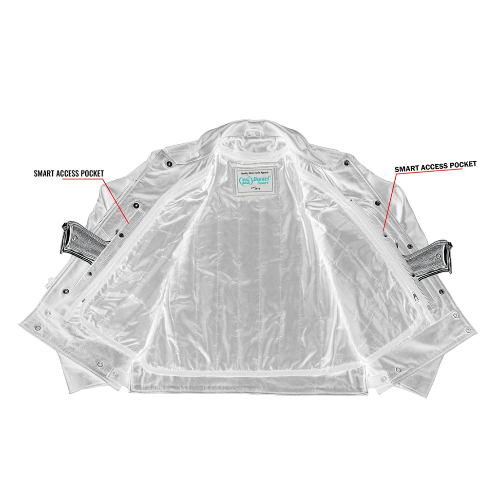 - Dual-entry pleated breast pockets with flap and silver snap buttons for easy access