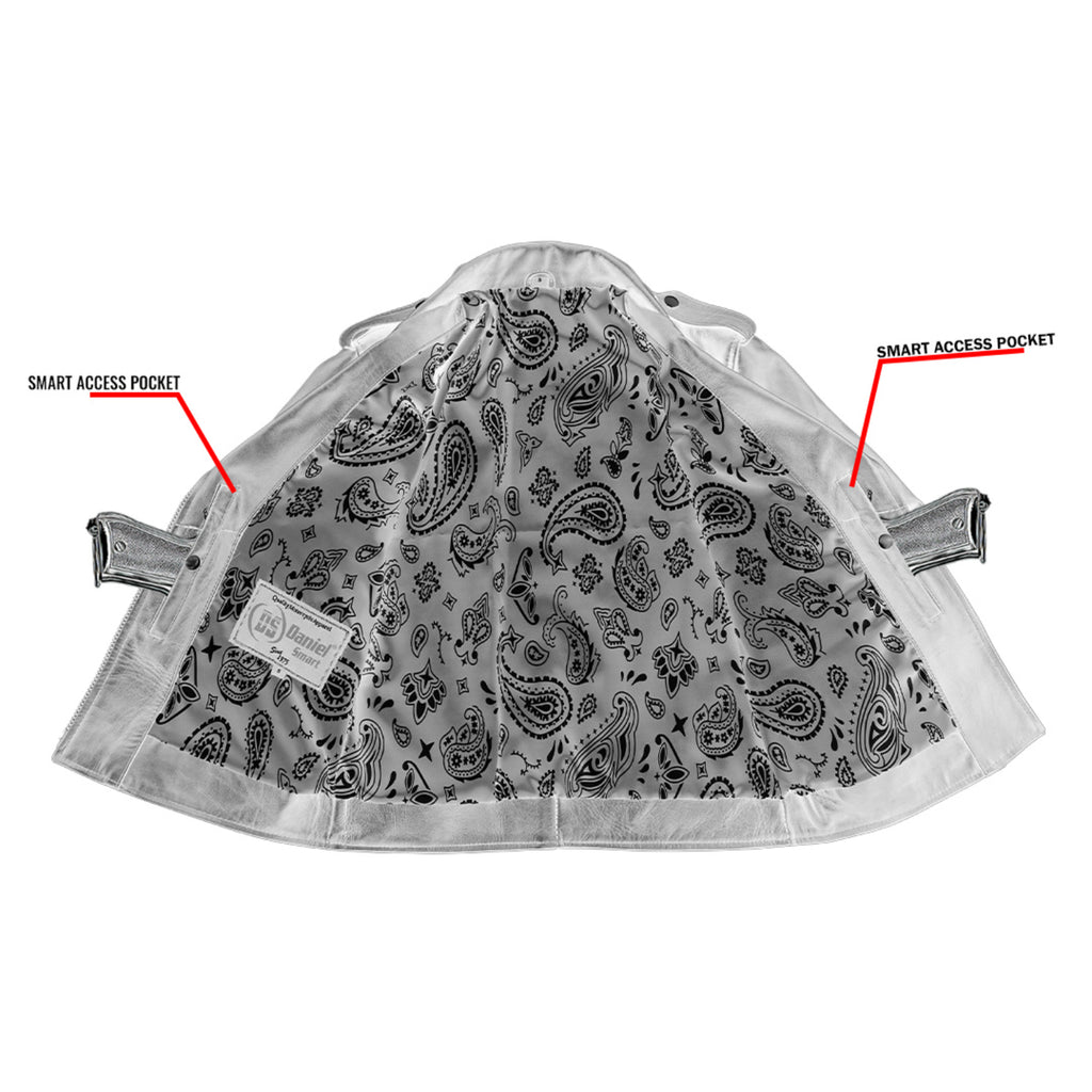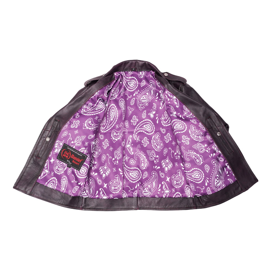 The Amora™ Women’s Leather Motorcycle Jacket blends bold fashion with high-quality craftsmanship, perfect for women seeking style, comfort, and performance on every ride. Constructed from high-quality cow waxed leather, this jacket features a vibrant purple outer shell that exudes confidence and individuality. The interior is thoughtfully designed for comfort and durability, featuring a soft cotton and Korean arm liner, along with a three-panel white stain vest liner and a complete sublimation lining with a purple background and white paisley detailing for a luxurious finish. A striking front zipper, wide lapel collar with silver buttons, and a built-in adjustable belt with silver buckle enhance the jacket’s classic biker silhouette. Crafted with heavy purple thread stitching and reinforced with original YKK zippers, the Amora™ jacket is built to last while delivering a bold, feminine statement on the road.
