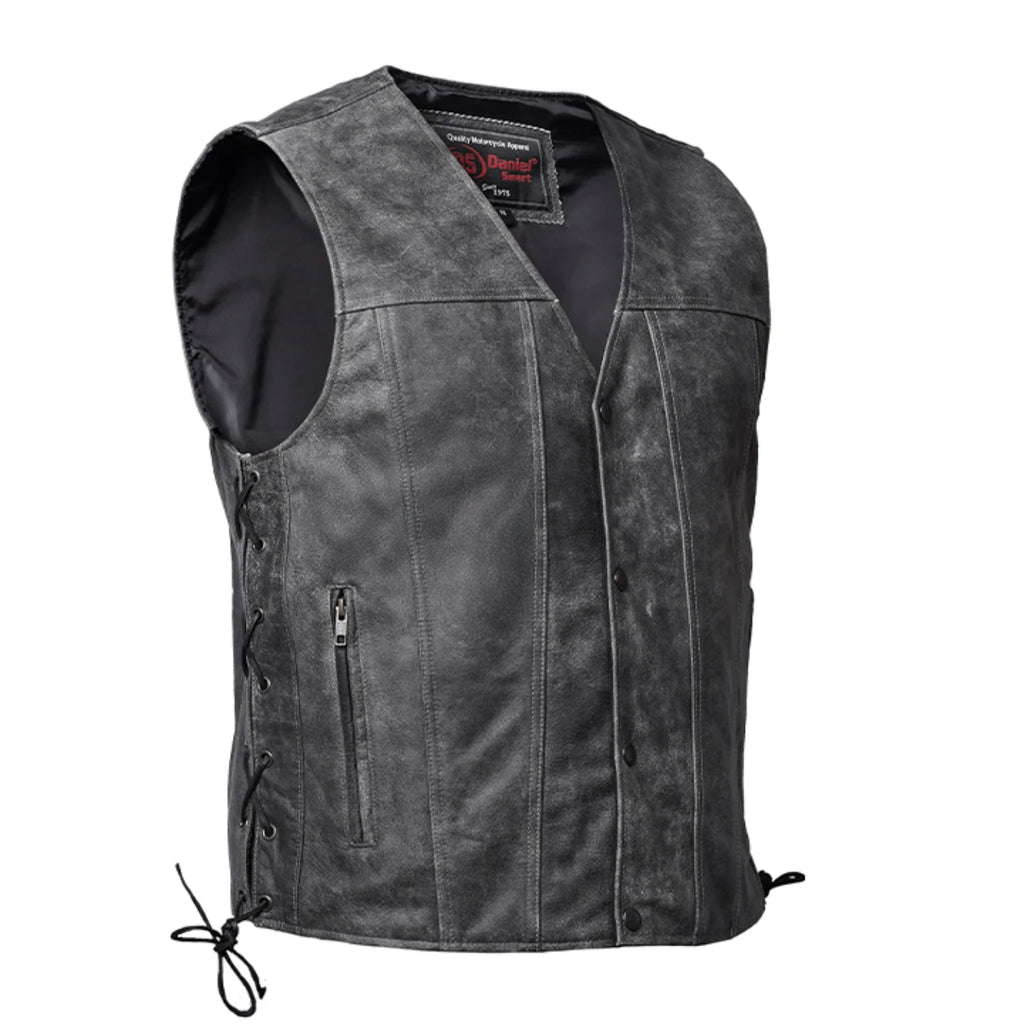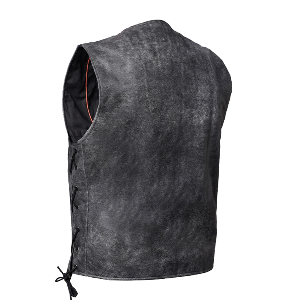 Finding the perfect balance between rugged durability and a comfortable fit can be tough. The Ashra vest, crafted from Soft Premium Drum Dyed Gray Cowhide 1.2 - 1.3mm Leather, offers the best of both worlds. Its V-neck design provides a clean, timeless look, while side lacing ensures a customizable fit for every rider. Inside, you'll find Conceal Carry pockets for essentials, along with reinforced shoulder support and heavy-duty stitching, built to last through every ride.