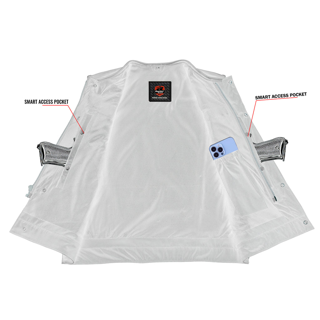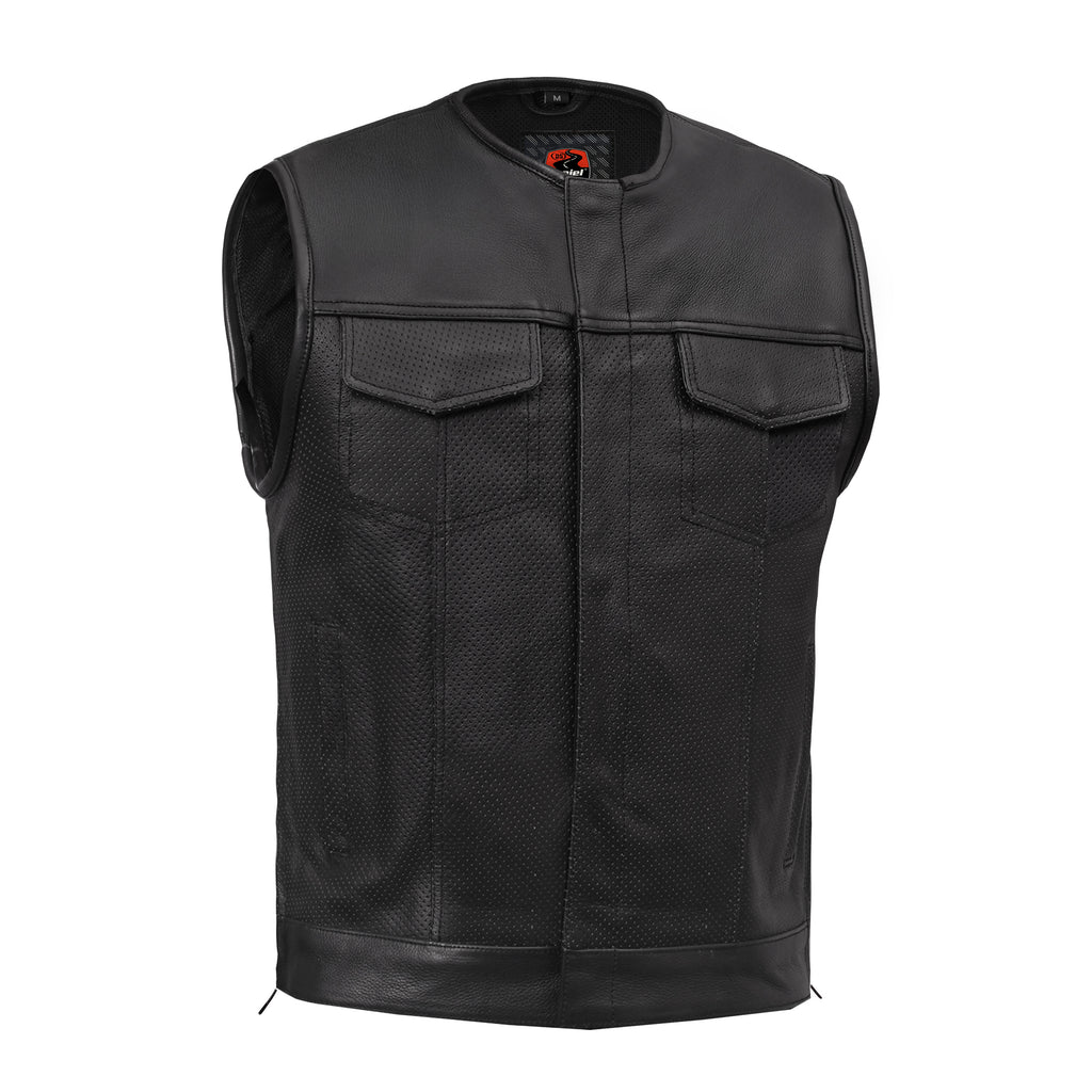 The Blackbird™ Perforated Men's Motorcycle Leather Vest is built for riders who want comfort, airflow, and clean club-style attitude. Crafted from diamond-soft milled cowhide leather (1.2–1.3mm), it delivers strong durability with a premium feel. Perforated leather panels improve airflow, keeping you cooler on long rides. The collarless design, flap chest pockets, and slash pockets add classic function, while a glasses holder keeps things handy. Side zippers offer a relaxed fit, and concealed carry pockets with tapered holsters keep essentials secure. A hidden YKK zipper under the snap placket gives a smooth front finish. Reinforced shoulders, mesh lining, hanging loop and heavy-duty stitching make it ride-ready.