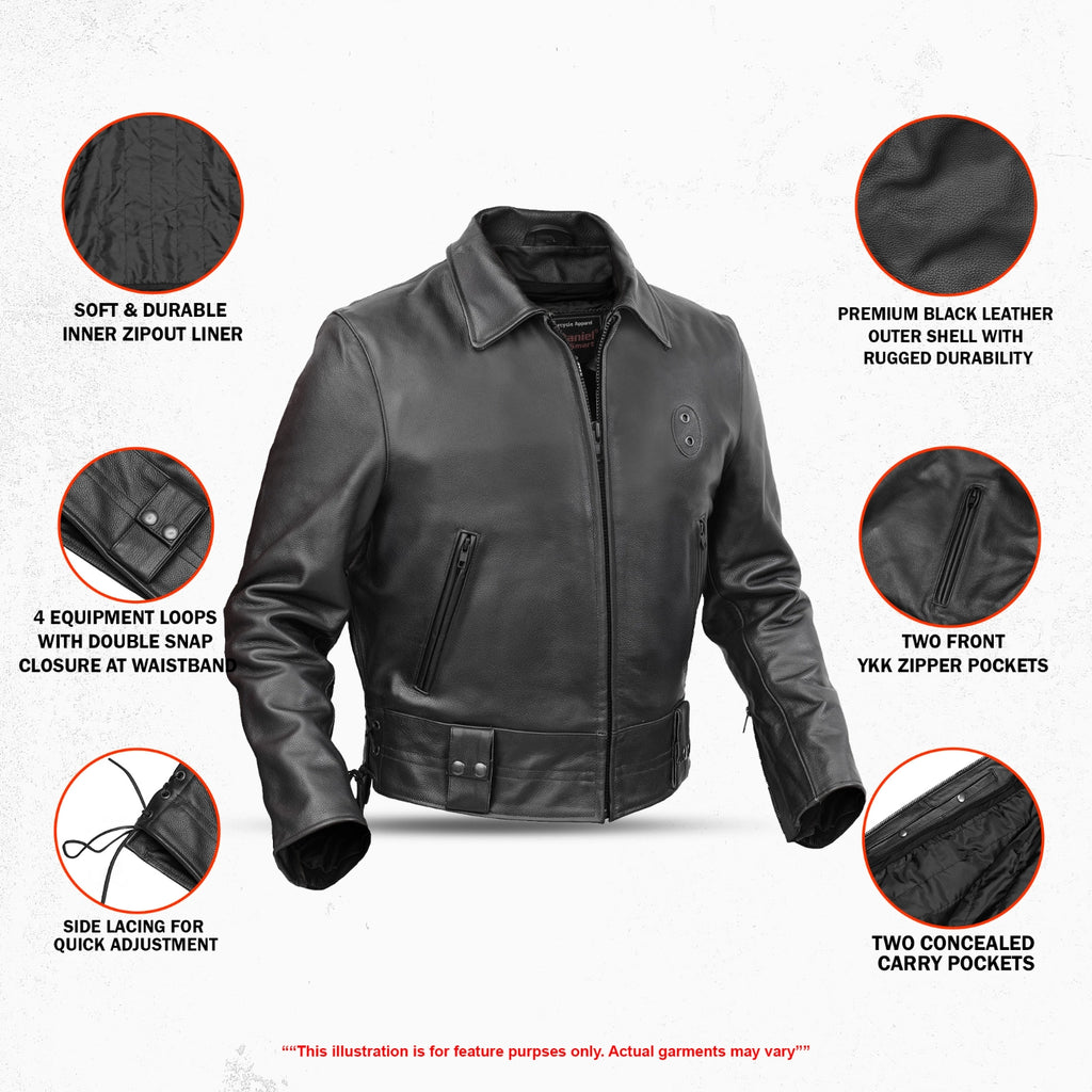 The Crime Stop Men’s Leather Motorcycle Jacket is built tough for riders who demand durability, function, and classic law-enforcement style. Part of our exclusive Police Line Collection, this jacket combines premium black leather with heavy-duty construction to deliver unmatched performance on and off the road. Designed with practical features for serious riders, the Crime Stop includes dual inside gun pockets with secure holsters, a large kidney belt for added back support, and multiple equipment loops to keep gear within reach. More than just outerwear, the Crime Stop is a statement piece built for control, confidence, and authority.