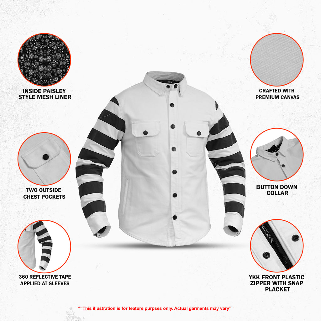 The Dark Devil™ Men’s Canvas Shirt merges high-visibility safety with rugged style and road-tested durability. Constructed from premium black canvas and detailed with 2" grey reflective Scotchlite stripes on both sleeves, this shirt is designed for riders who demand both function and flair day or night. Inside, dull white sublimated mesh lining offers breathability, while concealed Kevlar reinforcements in the sleeves and upper back provide enhanced protection where it matters most.