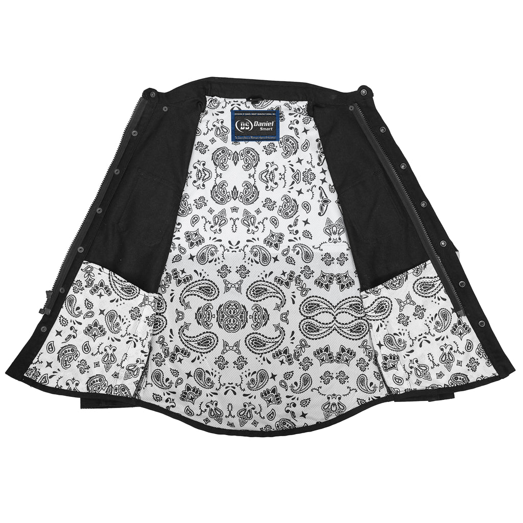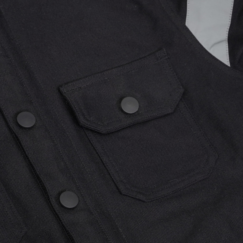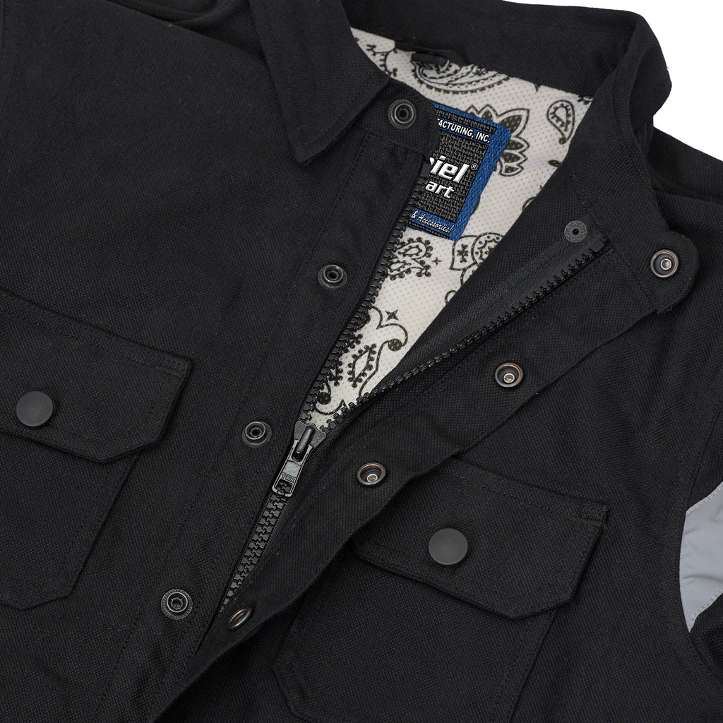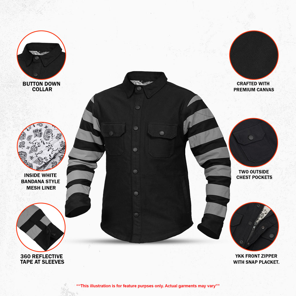 The Dark Devil Men’s Canvas Shirt merges high-visibility safety with rugged style and road-tested durability. Constructed from premium black canvas and detailed with 2" grey reflective Scotchlite stripes on both sleeves, this shirt is designed for riders who demand both function and flair—day or night. Inside, dull white sublimated mesh lining offers breathability, while concealed Kevlar reinforcements in the sleeves and upper back provide enhanced protection where it matters most.
