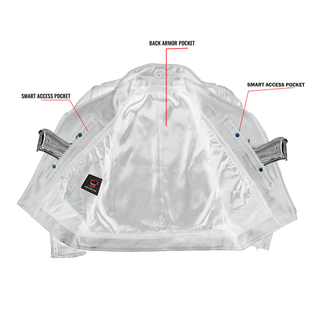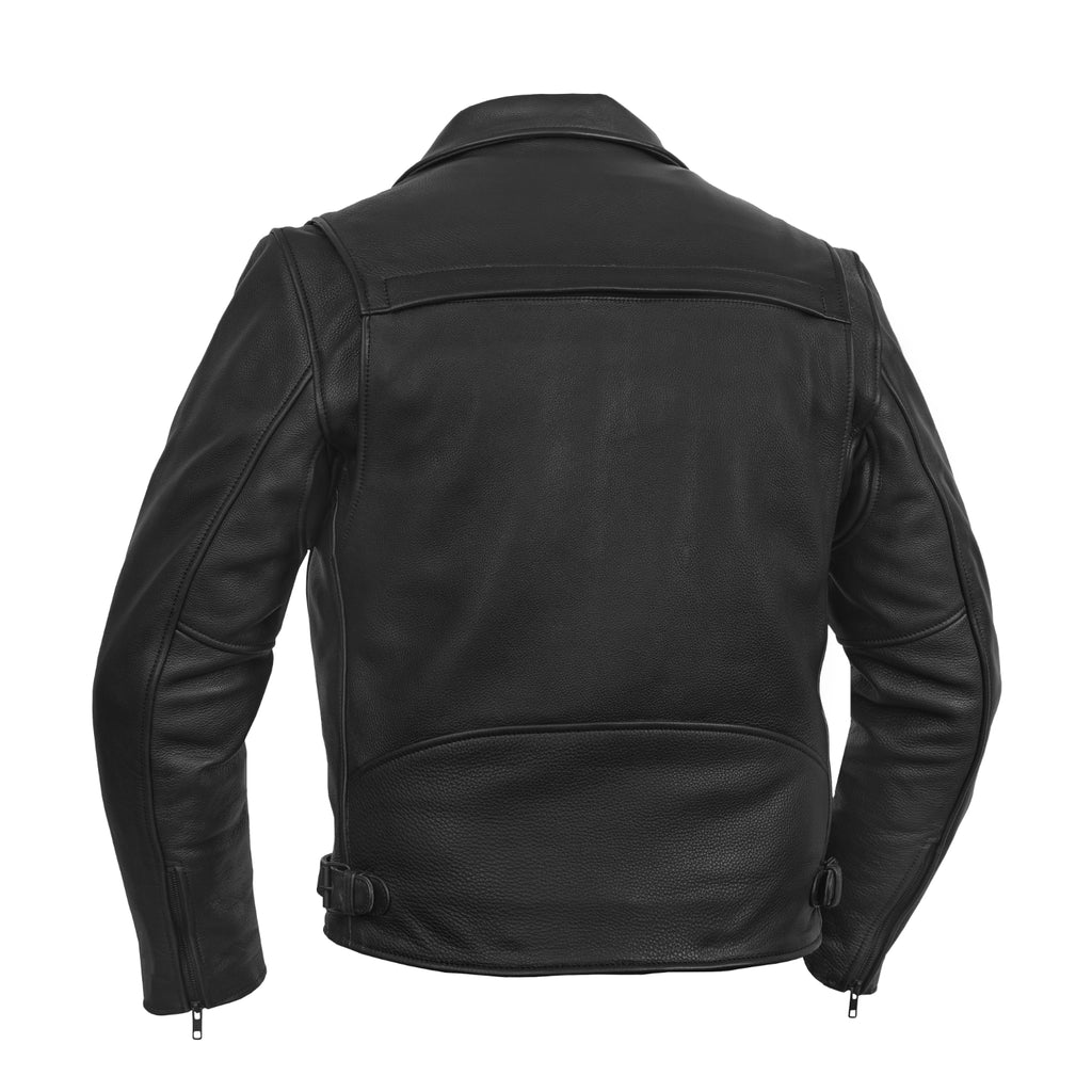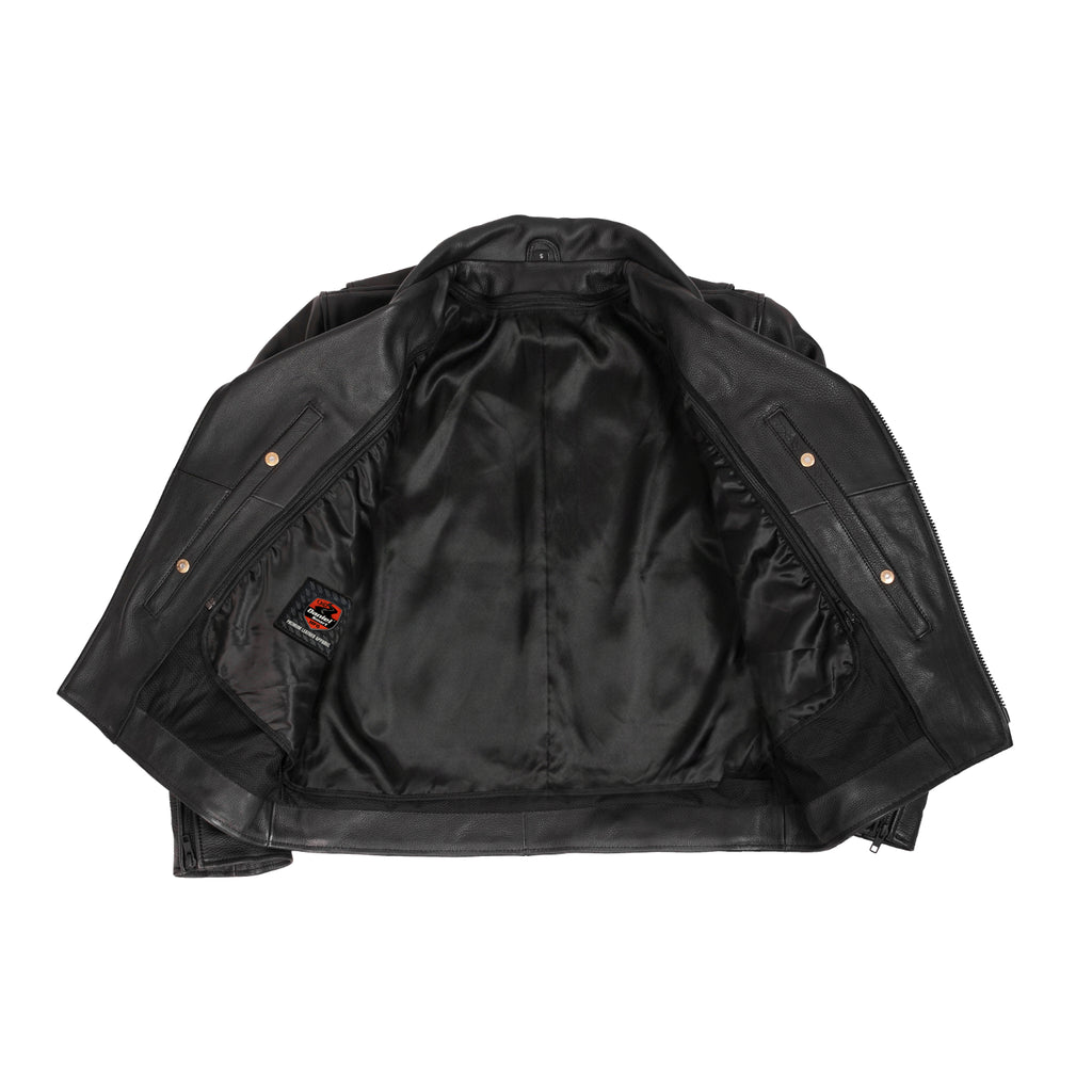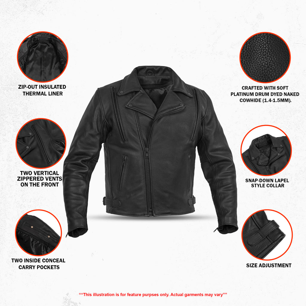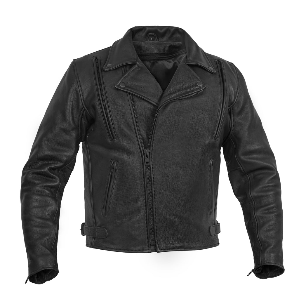 The Dark Matter Motorcycle Men’s Leather Jacket is crafted from soft platinum drum-dyed naked cowhide (1.4–1.5mm), delivering a rugged feel with a bold asymmetrical biker design. Featuring a snap-down lapel collar, zippered sleeve gussets, waist adjuster buckles, and a heavy-duty YKK front zipper, it offers a secure and comfortable riding fit. Dual front vents, underarm ventilation eyelets, rear zip vent, and a soft mesh back panel ensure continuous airflow, while the action back enhances mobility on long rides. Two zippered slash pockets and dual concealed carry pockets with tapered holsters provide secure storage, while CE-2 rated armor pockets add protection for the road. A zip-out insulated thermal liner ensures adaptable comfort in changing weather, and reinforced stitching with heavy-duty thread guarantees long-lasting durability. Premium cowhide construction, advanced ventilation, and aggressive motorcycle styling make this men’s biker leather jacket a powerful choice for serious riders.