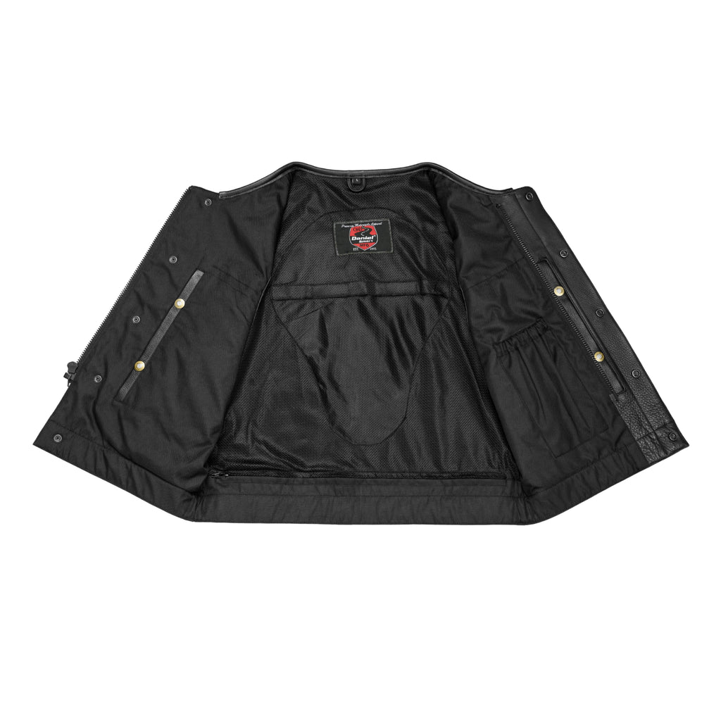Want something sleek and tough vest that’s built for the ride? The Drop Zone Men's Leather Motorcycle Vest is crafted from Soft Platinum Drum Dyed Truly Naked Cowhide 1.4 - 1.5mm Thick Leather for durability and a bold look. Designed with a hidden front zipper under a snap placket, snap chest pockets, and hand pockets, it delivers both function and classic biker style. The single-panel back makes it perfect for custom patches, while reinforced stitching, bullet-printed snaps, and YKK zippers ensure long-lasting wear. Ride in confidence with this rugged, no-nonsense vest.