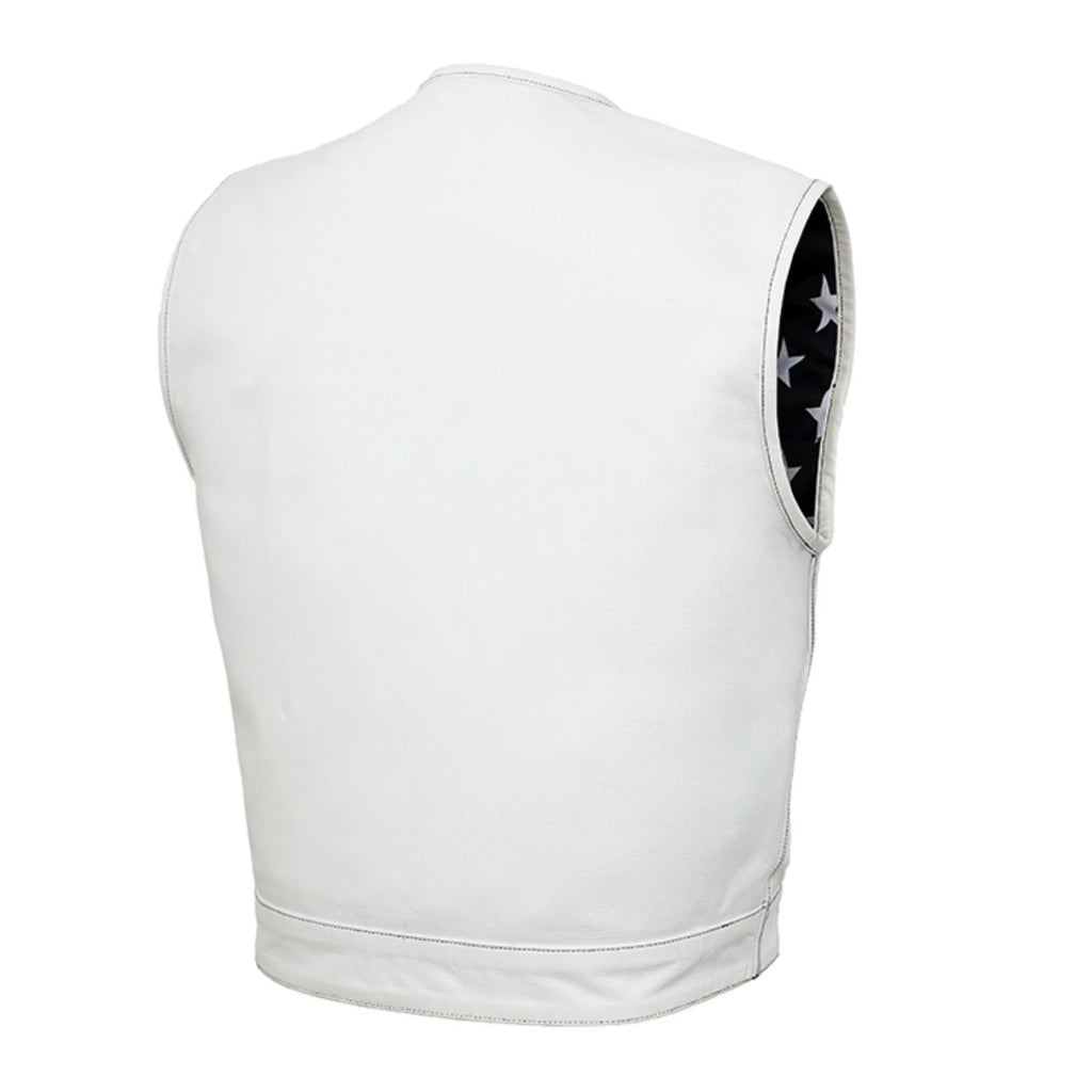 The Eagle Shell Men’s Leather Vest is designed for riders who want to stand out with style and ride with purpose. Crafted entirely from premium white leather, this vest combines striking aesthetics with serious functionality. The interior showcases a satin white American flag lining, adding a bold patriotic statement to your gear. With Conceal Carry gun pockets reinforced with durable elastic and holsters, and secure YKK zipper closure, this vest offers the strength and utility demanded by serious riders. Finished with custom eagle-engraved buttons, it's more than a vest—it's a symbol of identity, pride, and protection on the road.