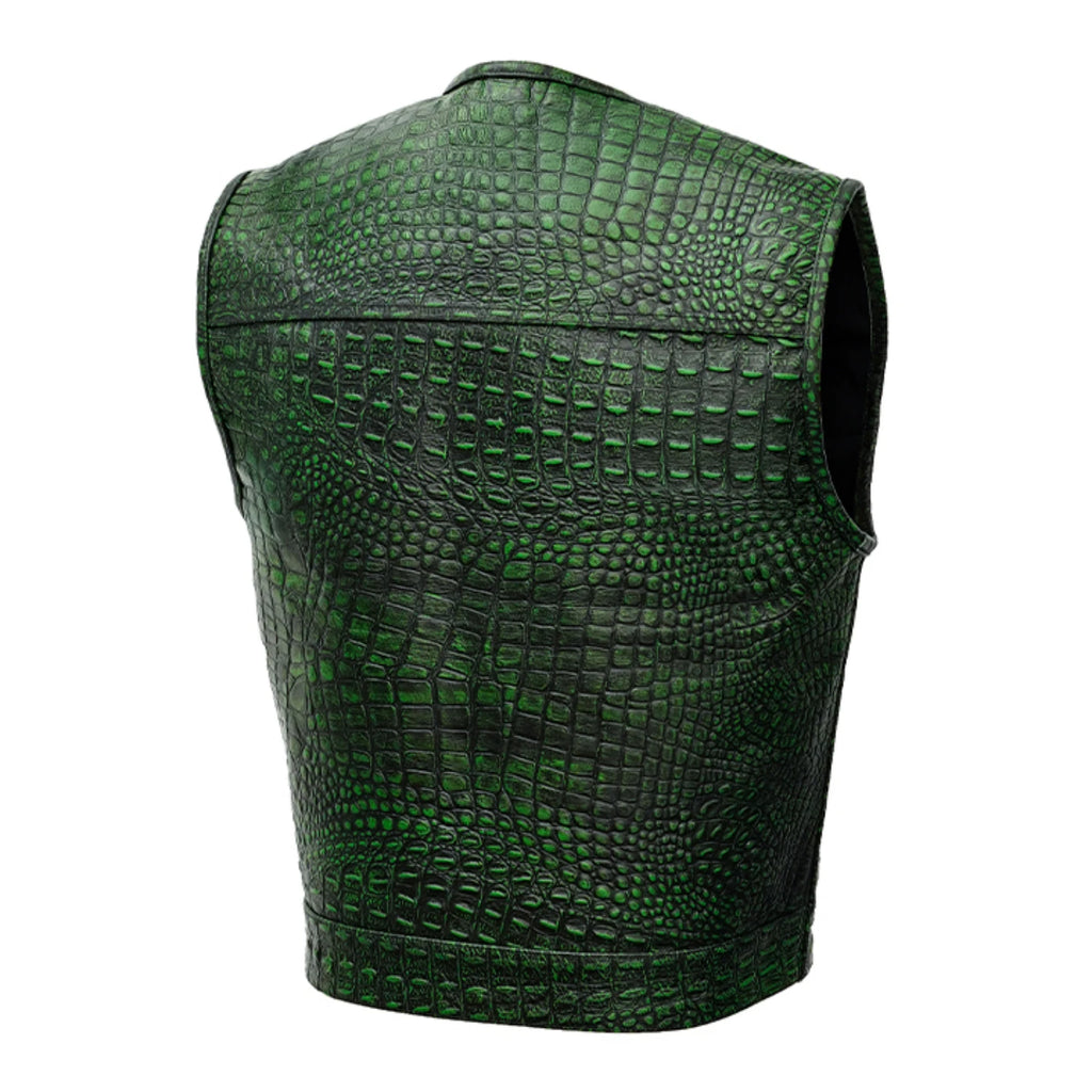 The Gator Glint Men’s Leather Vest redefines bold style and rugged durability with its distinctive crocodile-effect leather design in striking green and black tones. Built for riders, rebels, and those who make a statement wherever they go, this vest features a complete outer shell made from premium leather, offering both sophistication and strength.