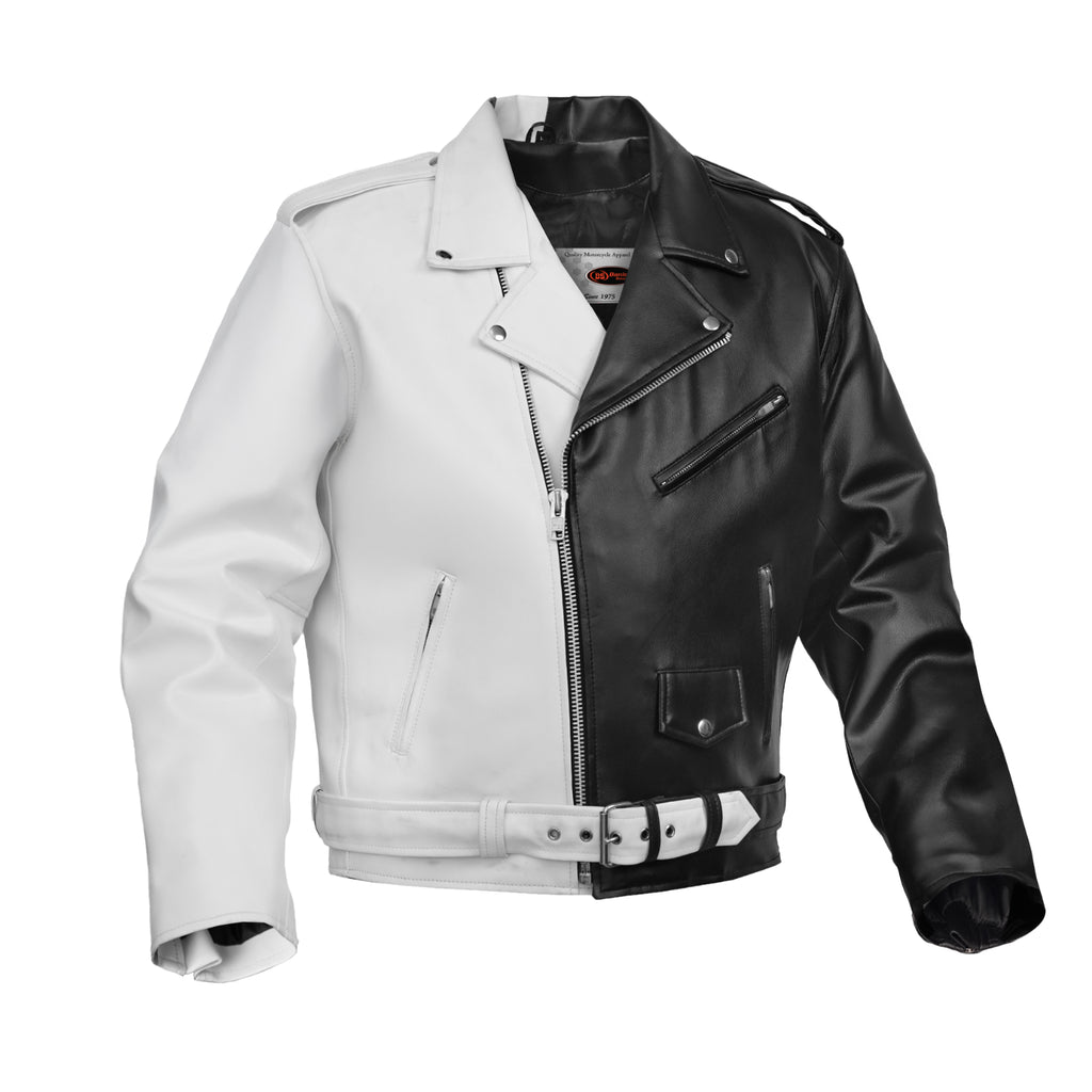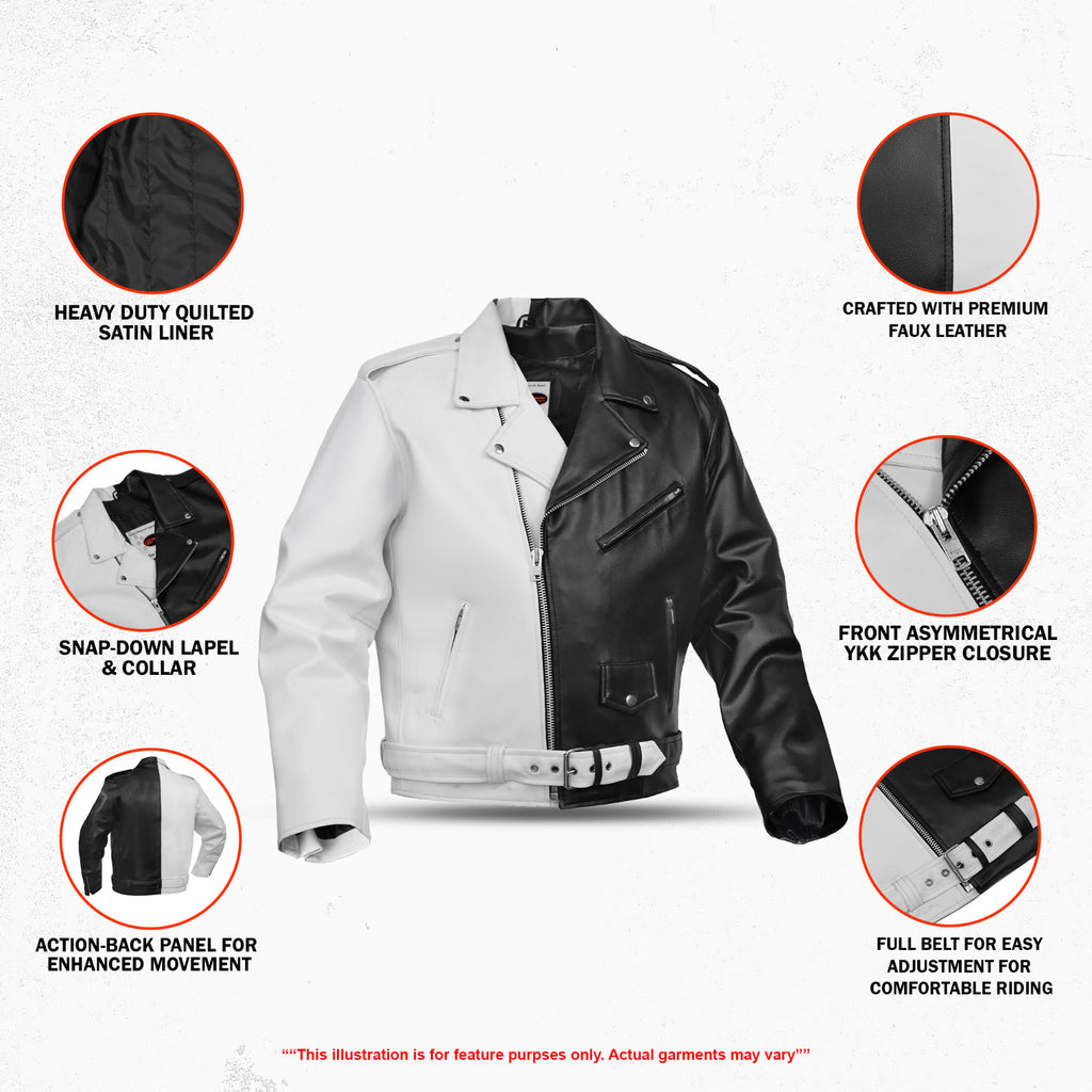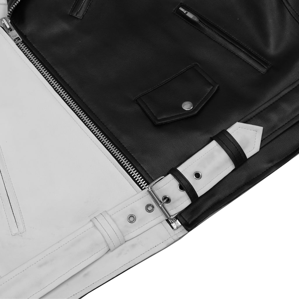The Gravepath Men’s Faux Leather Motorcycle Jacket blends modern craftsmanship with rugged biker aesthetics, built for riders who demand strength, style, and all-day comfort. Made from heavy-duty PVC synthetic leather, this jacket features a striking dual-color black and white outer shell that delivers a bold, standout look. The interior is engineered for performance with a 100 GRM quilt single-sided liner, providing warmth. A signature asymmetrical front zipper, wide lapel collar with snap buttons, and a built-in belt with a silver buckle complete its classic motorcycle silhouette. The addition of an action-back panel and adjustable cuff zippers gives riders enhanced flexibility and convenience on every ride. The Gravepath jacket is built for those who take both function and style seriously.