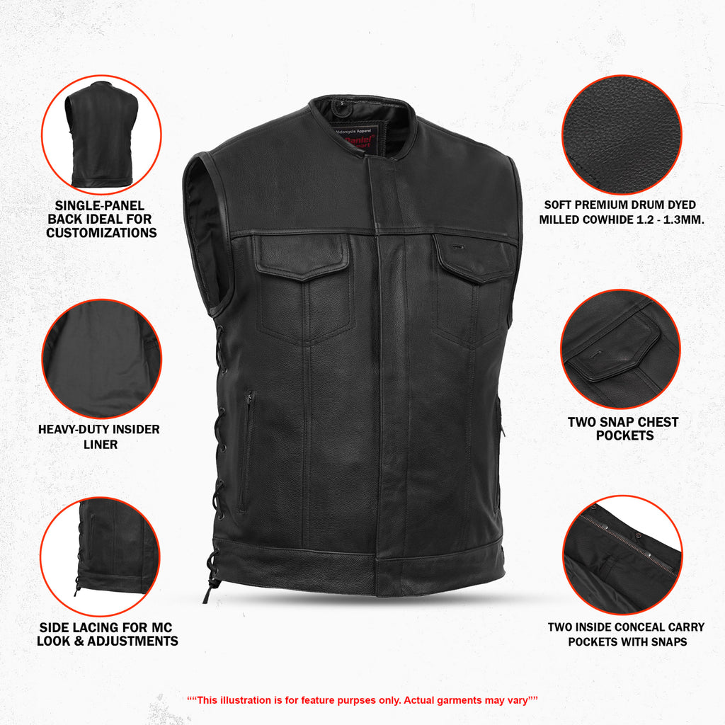 A rugged yet refined choice for riders who value both style and function, crafted with Soft Premium Drum Dyed Milled Cowhide 1.2 - 1.3mm leather. The collarless design offers a clean, modern look, while the side lacing adds a classic MC vibe with an adjustable fit. Built for the road, it features a glasses holder for easy access and secure pockets to keep essentials safe. The heavy-duty liner provides durability and comfort, making it a go-to vest for every ride. Plus, the single-panel back is perfect for adding custom patches or club logos.
