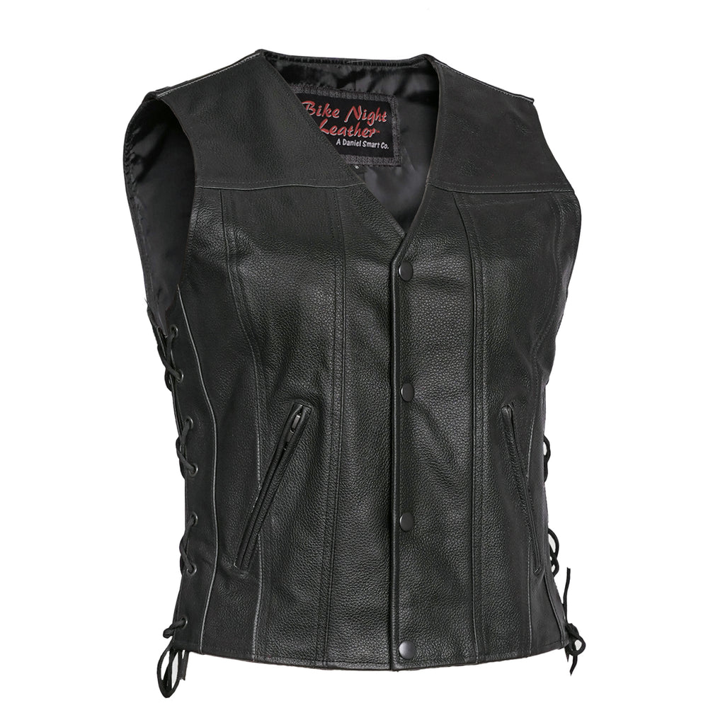 The Her Miles Women's Leather Vest blends timeless biker style with modern functionality. Crafted from Milled Promo Cowhide 1.1-1.2 mm Leather, it features a V-neck design and side lacing for an adjustable MC look. The classic antique black four-snap front closure adds a vintage touch, while two outside zippered hand pockets, two inside Conceal Carry pockets, and an inside mobile pocket provide ample storage. The single-panel back allows for easy customization. Designed with a heavy-duty satin liner and reinforced shoulder support, this vest offers both durability and comfort.