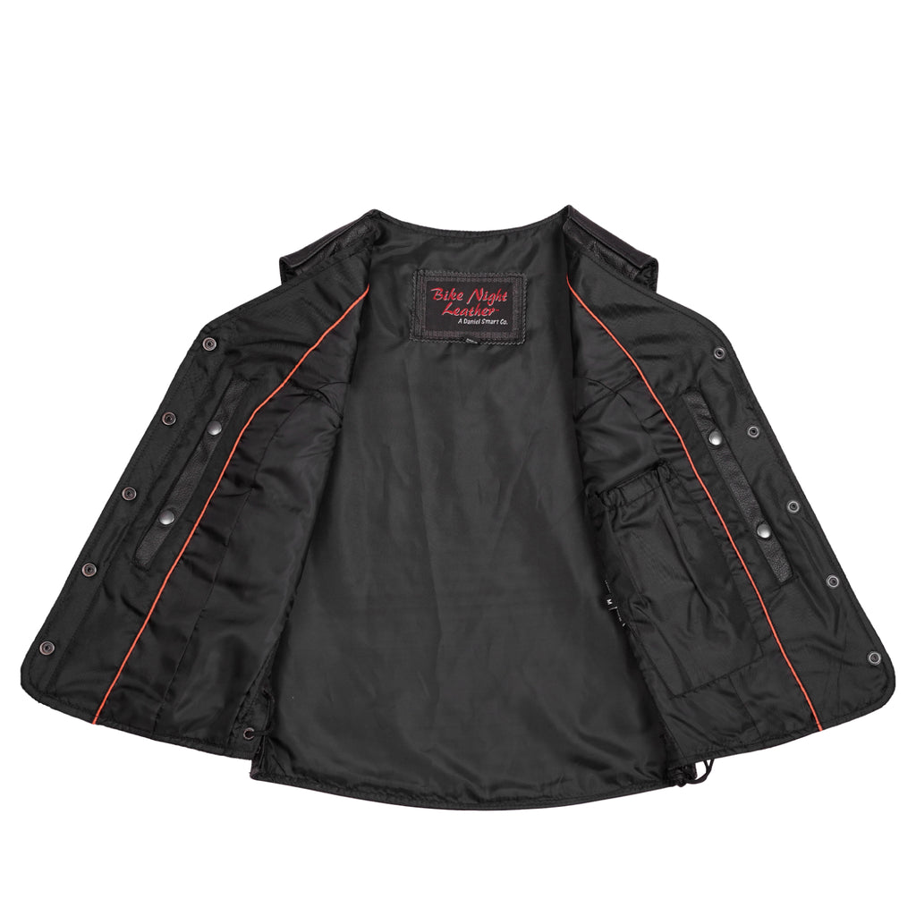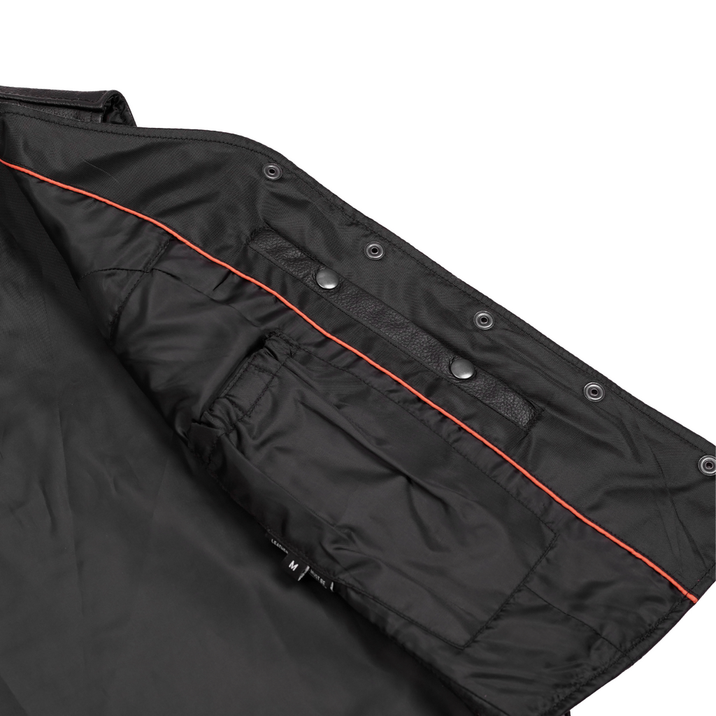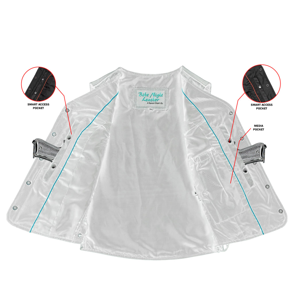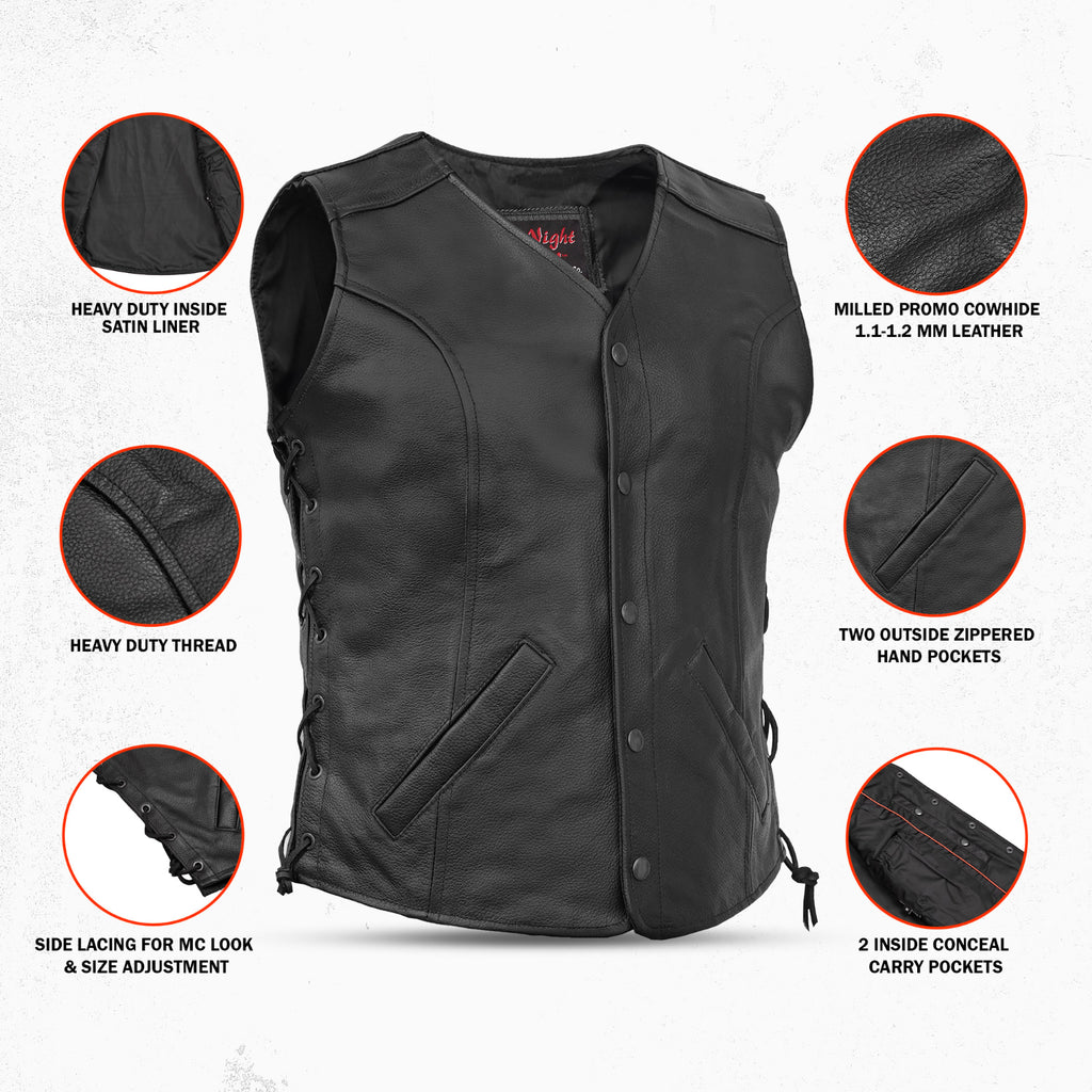 The Lacera Women's Leather Vest is designed for riders who demand both style and functionality. Made from Milled Promo Cowhide 1.1-1.2 mm Leather, it features an open-neck style and side lacing for an MC look and adjustable fit. The classic antique black four-snap front closure ensures a timeless appeal. With two outside zippered hand pockets, two inside Conceal Carry pockets, and an inside mobile pocket, it offers ample storage. The single-panel back allows for easy customization, while the heavy-duty satin liner and reinforced shoulder support provide durability and comfort.