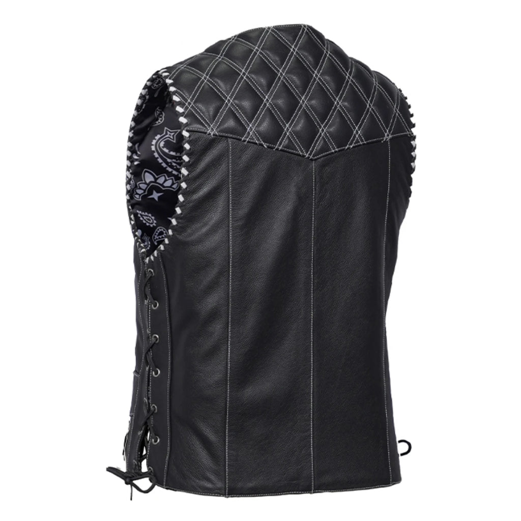 The Midnight Thread Men’s Leather Motorcycle Vest is built for riders who want rugged strength with a touch of unique style. Crafted from premium black leather with fine detailing, this vest brings together function and durability. Designed with bold embroidery on the chest panels and a paisley-style printed lining, the Midnight Thread offers a refined edge that speaks of confidence and biker spirit. Heavy thread stitching guarantees long-lasting performance, while side laces and adjustable eyelets allow for a custom fit. White stitching and white braiding along the armholes add the finishing touches to this powerful design.
