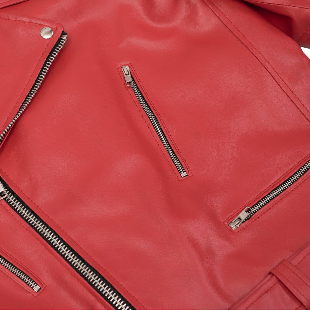 The Reaper Men’s Faux Leather Motorcycle Jacket brings bold attitude and timeless biker style together, designed for riders who appreciate a fearless look with modern practicality. Crafted from premium faux leather, this jacket stands out with its deep and vibrant red exterior, giving you a confident, standout presence whether you're on the road or off-duty. Built with a classic asymmetrical front zipper, silver hardware, and a wide lapel collar secured with snap buttons, the Reaper jacket captures the spirit of classic moto fashion. The adjustable waist belt and zippered cuffs provide a custom fit, while the thoughtfully placed zip pockets offer convenient storage for daily essentials. A soft inner lining ensures comfort through long rides, and the heavy-duty stitching delivers durability that lasts.