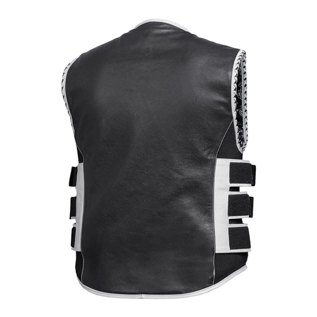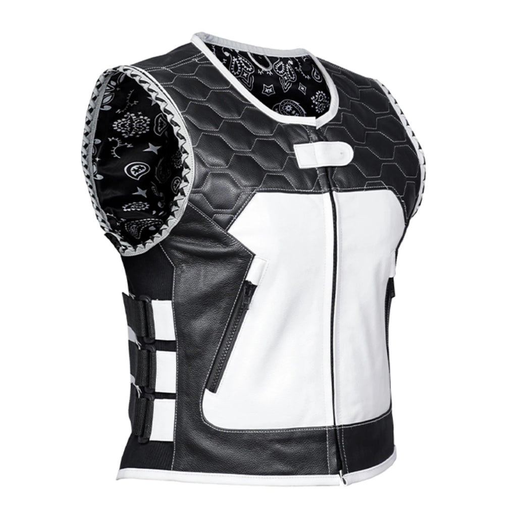 The Shadow Pearl Women’s Leather Vest brings together strength, style, and sophistication for the modern female rider. Made from high-grade black leather and accented with crisp white trim, this vest features a sleek silhouette with a bold personality. The honey comb quilting on the chest panel adds texture and comfort, while the interior is finished with soft white satin and a stylish paisley print for a feminine edge.