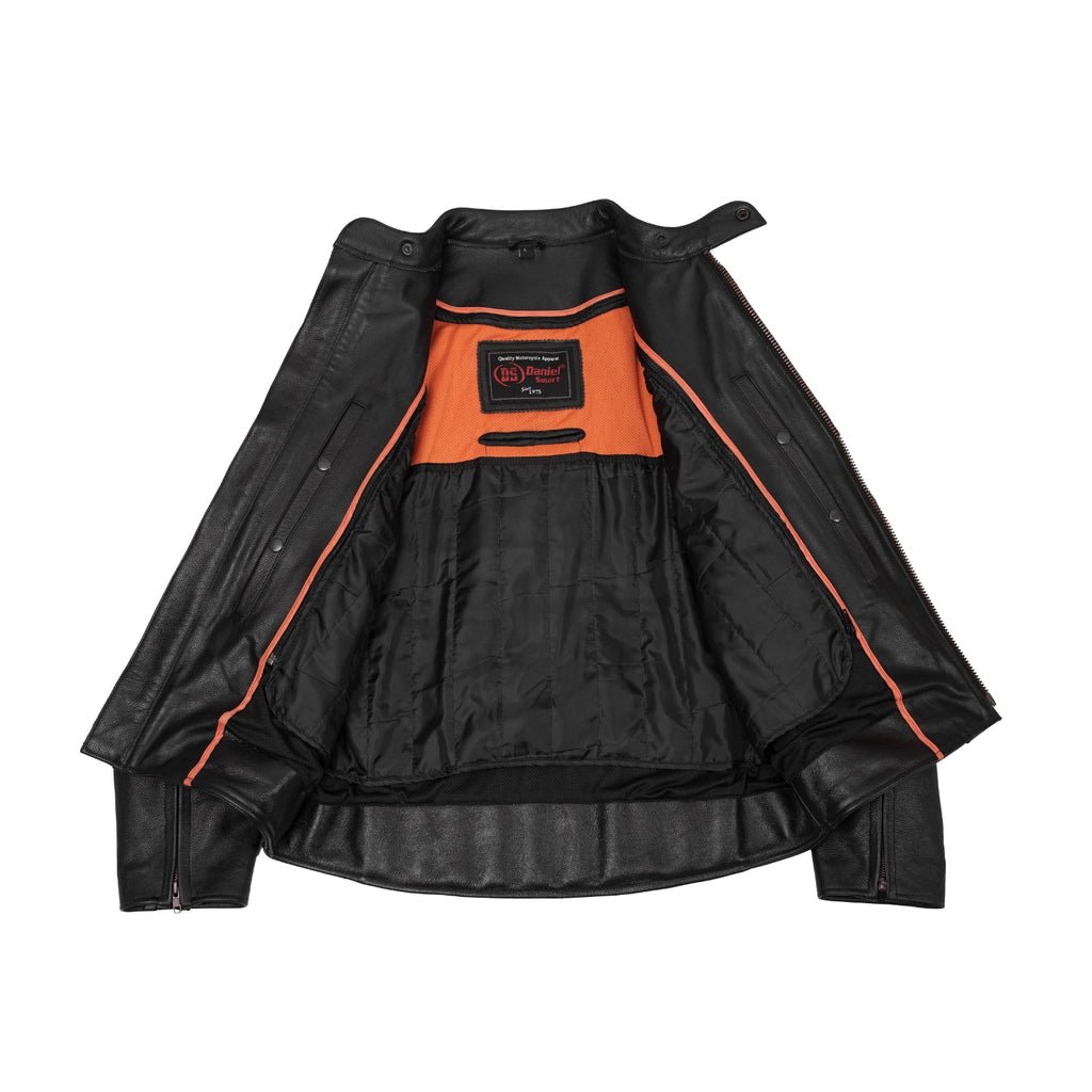 The Skybound Men's Leather Motorcycle Jacket delivers a perfect display of strength and comfort. The jacket is made from Milled Cowhide 1.3 - 1.4 mm. The jacket also features a stylish Euro collar and a padded kidney belt for added lower back support and custom fit. Moreover, it has plain sides, giving you a clean and minimalist look. The front and back channel venting system ensures optimal airflow to regulate your body temperature.