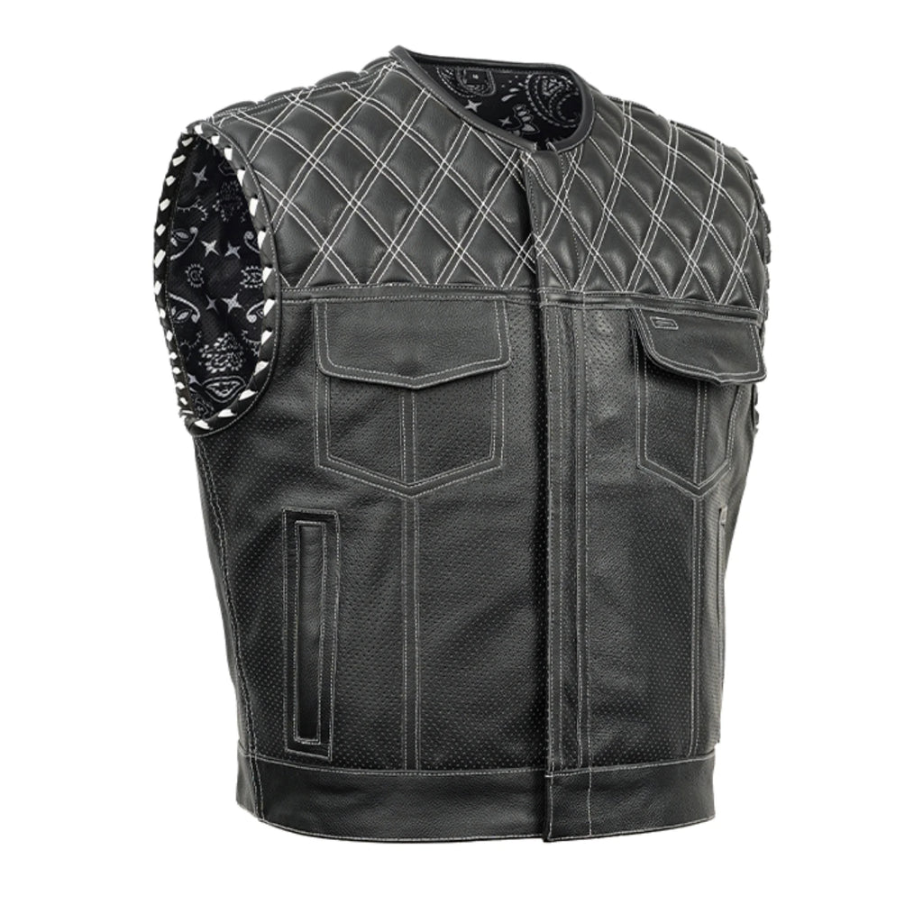 The Sledgehammer Men's Leather Vest stands as a symbol of rugged craftsmanship and bold street style. Crafted from premium black leather, the complete outer shell offers durability with a refined, vintage edge, perfect for bikers and those who appreciate classic gear with a modern attitude. The lower front and back panels feature black perforation, ensuring improved airflow—ideal for warmer rides without sacrificing protection.