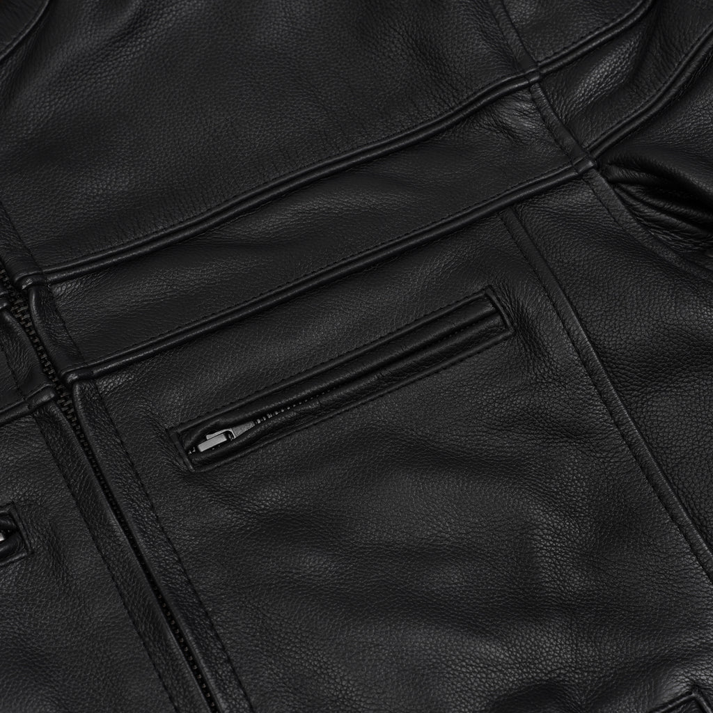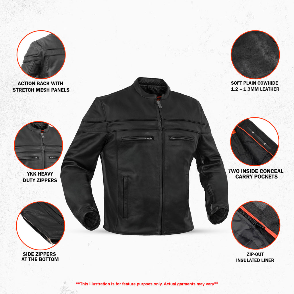 The Vigilant™ Men's Leather Motorcycle Jacket is designed for riders seeking a combination of style, comfort, and performance. The jacket is made from soft, plain cowhide 1.2 – 1.3mm Leather. It has a mandarin collar with sporty stripe detailing, along with the perforated action back to help you be stylish and have better airflow. You will never need another jacket for long rides with this one. It has side zippers and multiple vents for superior cooling.