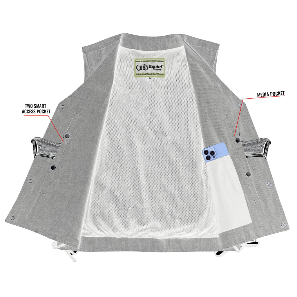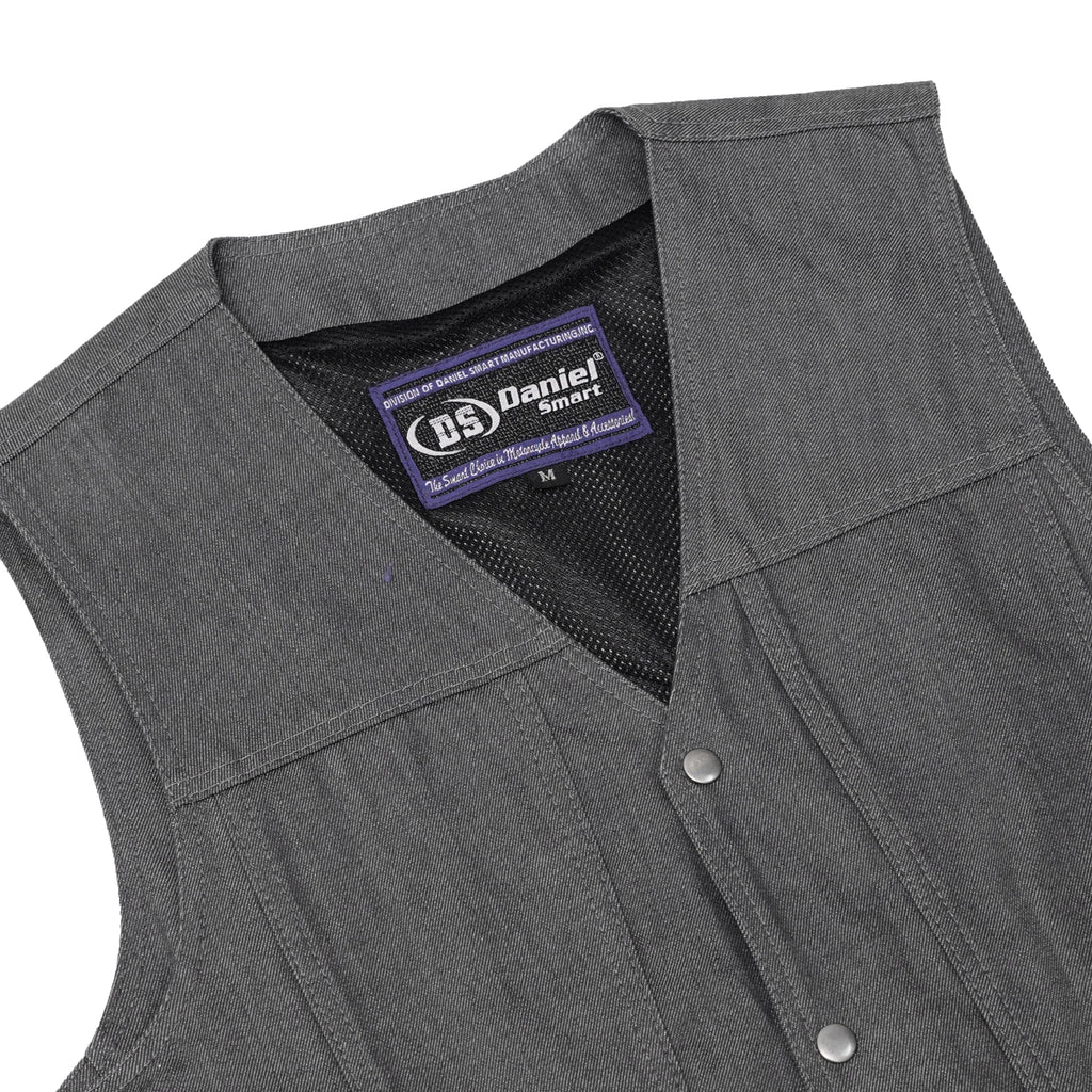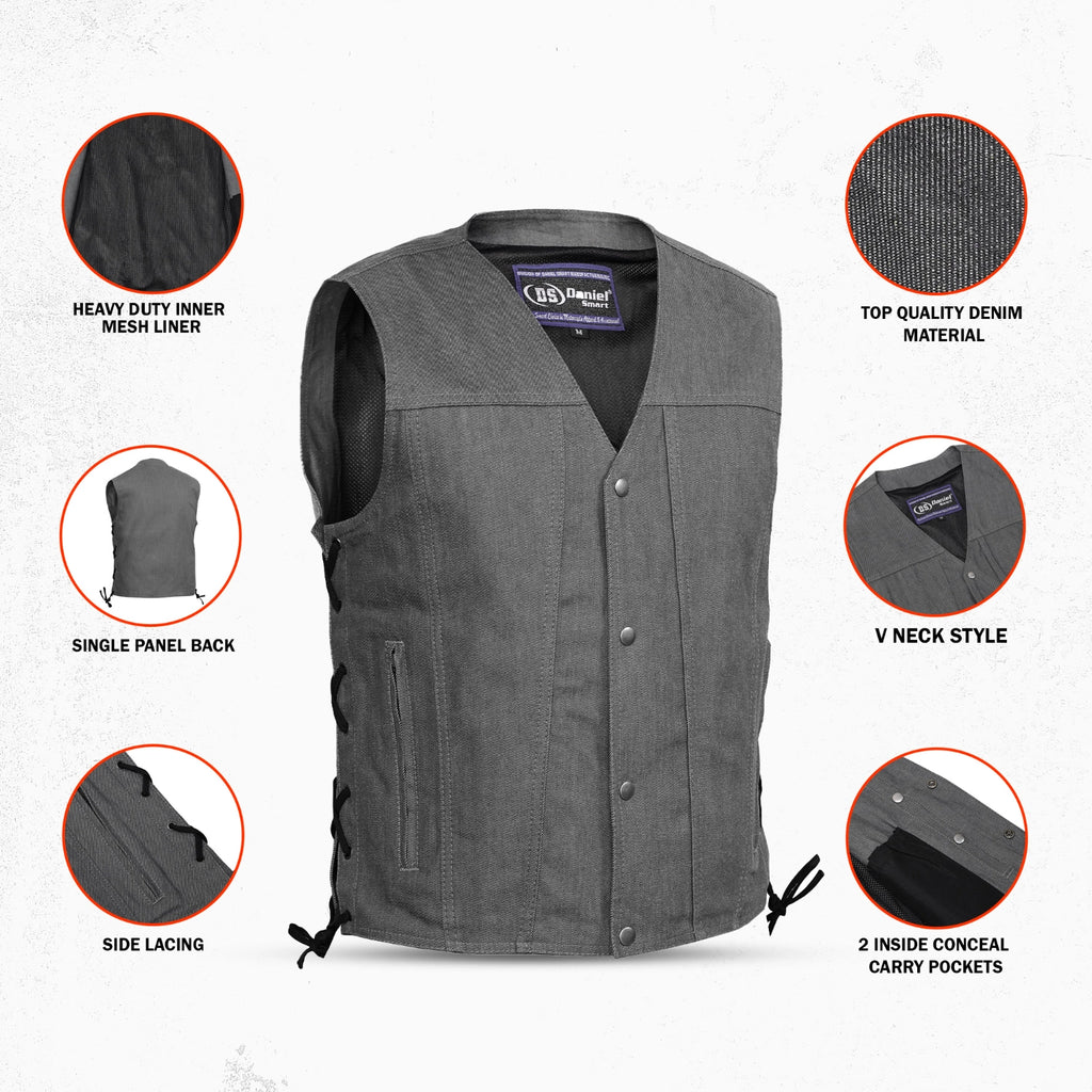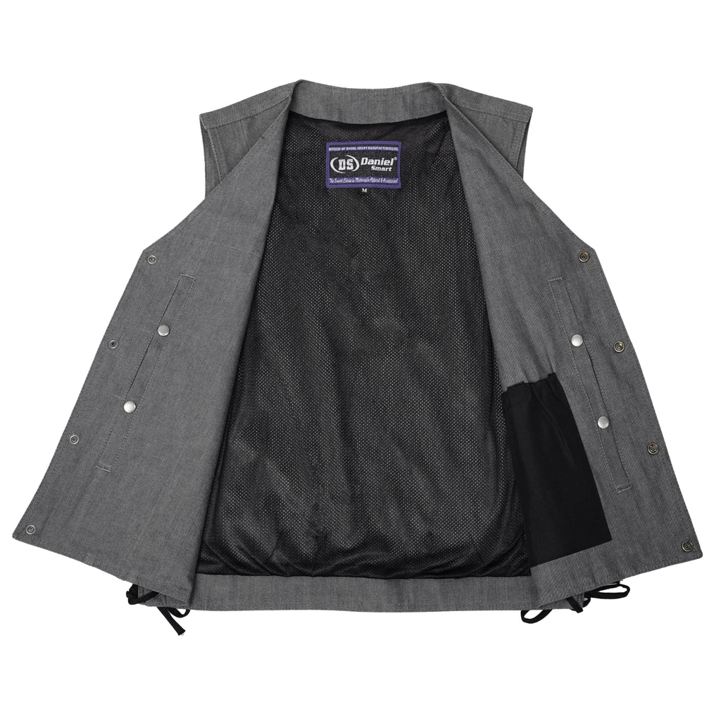 The Wild Venture Men's Denim Motorcycle Vest is designed for riders who value both style and functionality. Made from premium-quality denim, this vest features a classic V-neck design with side lacing for an adjustable fit. It includes two zippered hand pockets for secure storage and a front closure with four gunmetal snaps for a sleek finish. Inside, you’ll find two smart-access pockets along with a dedicated cellphone pocket for added convenience. Reinforced shoulder support enhances durability, while the heavy-duty mesh liner ensures comfort on long rides. The single-panel back allows for easy customization, making it a perfect choice for bikers who want a vest that’s both rugged and versatile.